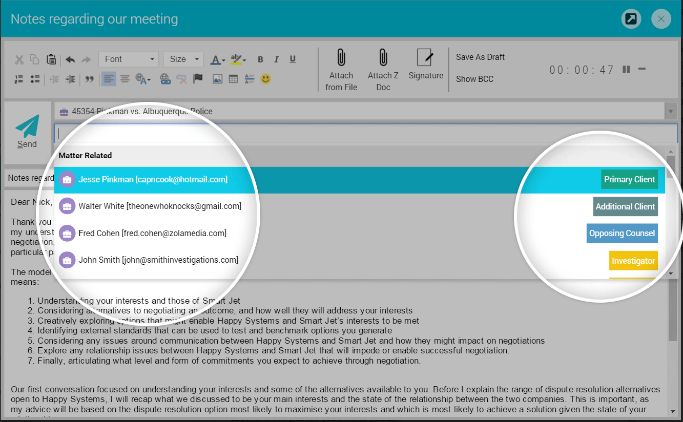 In CARET Legal, your email contacts can be assigned to specified matters. When sending an email, you can select the designated matter associated with your message and voilà, each matter-specific contact will appear, along with their role. With CARET Legal, you can easily send the message to any or all the matter-related contacts without fear.