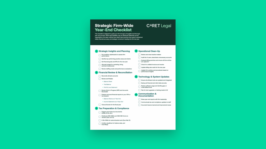 This checklist is designed to guide your firm through a thoughtful and thorough year-end process. While responsibilities may be distributed differently across organizations, the tasks outlined here reflect best practices that support operational clarity, financial accuracy, and strategic momentum heading into the new year.
